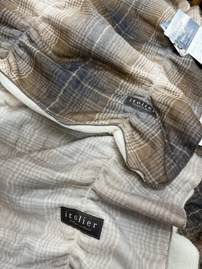 チェック柄のほうが綿ガーゼ素材、裏の白地のほうがウール素材です。