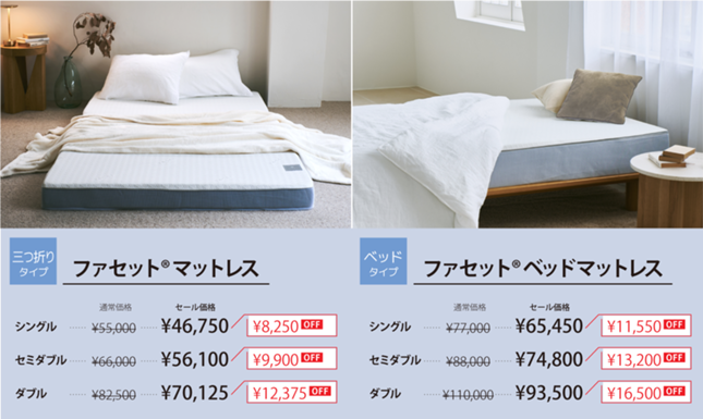 定番商品の「ファセット®マットレス」シリーズ対象商品が15%OFFとなります。