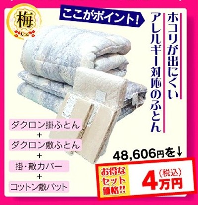【梅セット】は、ホコリのでにくいインビスタ社のダクロン🄬綿を使ったお布団。