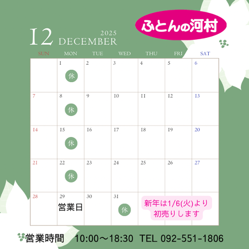 いつもふとんの河村をご愛顧いただき誠にありがとうございます。2025年12月の店休日のお知らせです。当店は毎週月曜日が定休日となっております。12月最後の月曜日にあたる12月29日は定休日返上で10:00~18:30まで営業いたします。尚、12月31日(水)~1月5日(月)までは年末年始のお休みを頂戴します。...