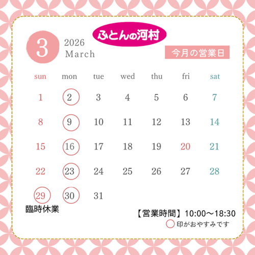 いつもふとんの河村をご愛顧いただき誠にありがとうございます。さて、2026年3月の店休日についてのご案内です。今月は毎週月曜日の定休日に加えて、3/29(日)は臨時休業させて頂き、3/29(日)~3/30(月)連休となります。皆さま方にはご迷惑をおかけ致しますが何卒ご容赦くださいませ。なお、ただいま、春の新生...