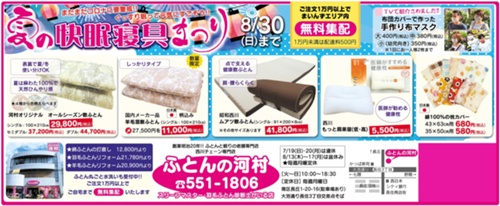 いつもふとんの河村をご愛顧頂き、誠にありがとうございます。今年も恒例の『夏の快眠寝具まつり』を8/12(木)まで開催いたします。例年であれば、折り込みチラシ等でセールのご案内をしておりますが、今年も昨年に引き続きコロナ禍という状況下、お客様の密な状態を避けるため、折り込みチラシの配布は中止し、地域フリーペーパ...